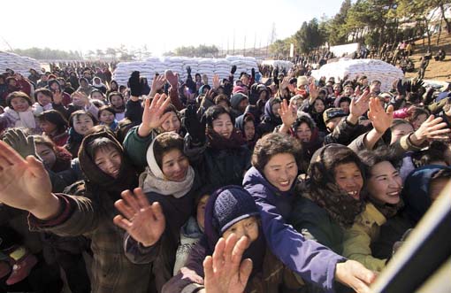 天寒地凍,慈濟人用感恩、尊重、愛,直接重點接觸了鄉親,完成了極具歷史意義的捐贈儀式。兩位朝鮮翻譯人員協助志工將佛教慈濟功德會會旗插在無宗教信仰的土地上;全球慈濟人送來的大米疊得像瓦房一樣——見證了「為佛教、為眾生」的歷史畫面,我按下快門的撼動無法言喻,浸潤淚水的雙眼差點讓畫面失焦。