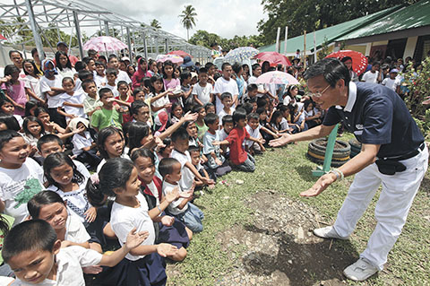 豔陽高掛的正午,位於震央的薩巴焉小學師生,依舊是熱情如炙地歡迎慈濟志工。來自馬尼拉的志工蔡青山(右),為了簡易教室援建事宜,半年來已不知踏進校園多少次了。