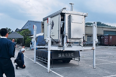 蔡堅印最滿意的亮點,是那能屈能伸的升降系統:「它有四支腳,可以延伸拉開。臺灣的卡車最寬是二點五公尺,這個機組可以拉到二點八公尺寬,高度可以升到一點一公尺,拉開升高後,卡車車斗就可以進去,不需要堆高機、吊車。」