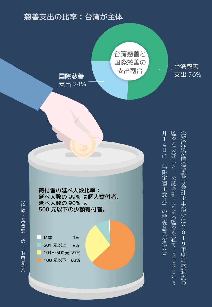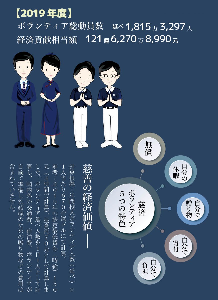 慈済ボランティアの二〇一九年度における総動員数は延べ千八百万人に達し、恩恵を受けた人の数は二千百万人を超えた。背後にある諸々の奉仕による愛の価値が社会にもたらした効果と影響力について、国際的コンサルティンググループの「安侯建業(KPMG)」が専門的に分析したところ、例えば二〇一八年「慈済板橋静思堂」が携わったコミュニティサービスの社会的投資利益率(Social Return on Investment、SROI)は五十・三七にも上った。これは、一元の投資が五十・三七元の効果を生み出したことを意味し、慈善効果としてはほぼ世界最高ともいえる水準である。