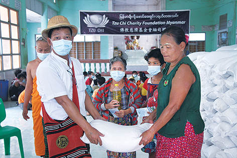ミャンマーのコロナ禍は次第に落ち着いて来ていたが、いくつかの村は未だ通行止めになっており、工場は大量雇用の見通しが立っていなかった。ボランティアは救済措置として配付活動を継続し、十月にはチミンダイン地区で八千三百余りの生活困窮世帯に物資を届けた。住民は老若男女を問わず、自主的に米を配付地点まで運ぶ手伝いをした。住民のチョー・ミン・ナインさんは、毎日未明の三時半に川を渡って、市場で運搬工として働いている。「コロナ禍で物価が上がり、生活は厳しくなりましたが、慈済からお米をいただくことができて、とても感謝しています。ですから、お米を運ぶのは、ちっとも大変ではありません!」と言った。