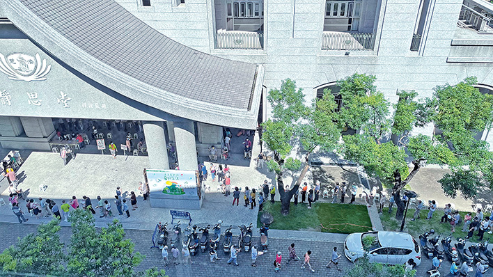 そして、文心南路にある台中静思堂には、朝七時過ぎから人々がやってきて列を作った。MRT豊楽公園駅から見下ろすと、曲がりくねった龍のような長い列が左側にある交差点にまで続いていた。ボランティアは忙しく、人々が一休みできるように椅子を並べた。民権連絡所も同じような状況で、ボランティアは人々のためにありったけの日傘を運び出して日除けサービスをした。