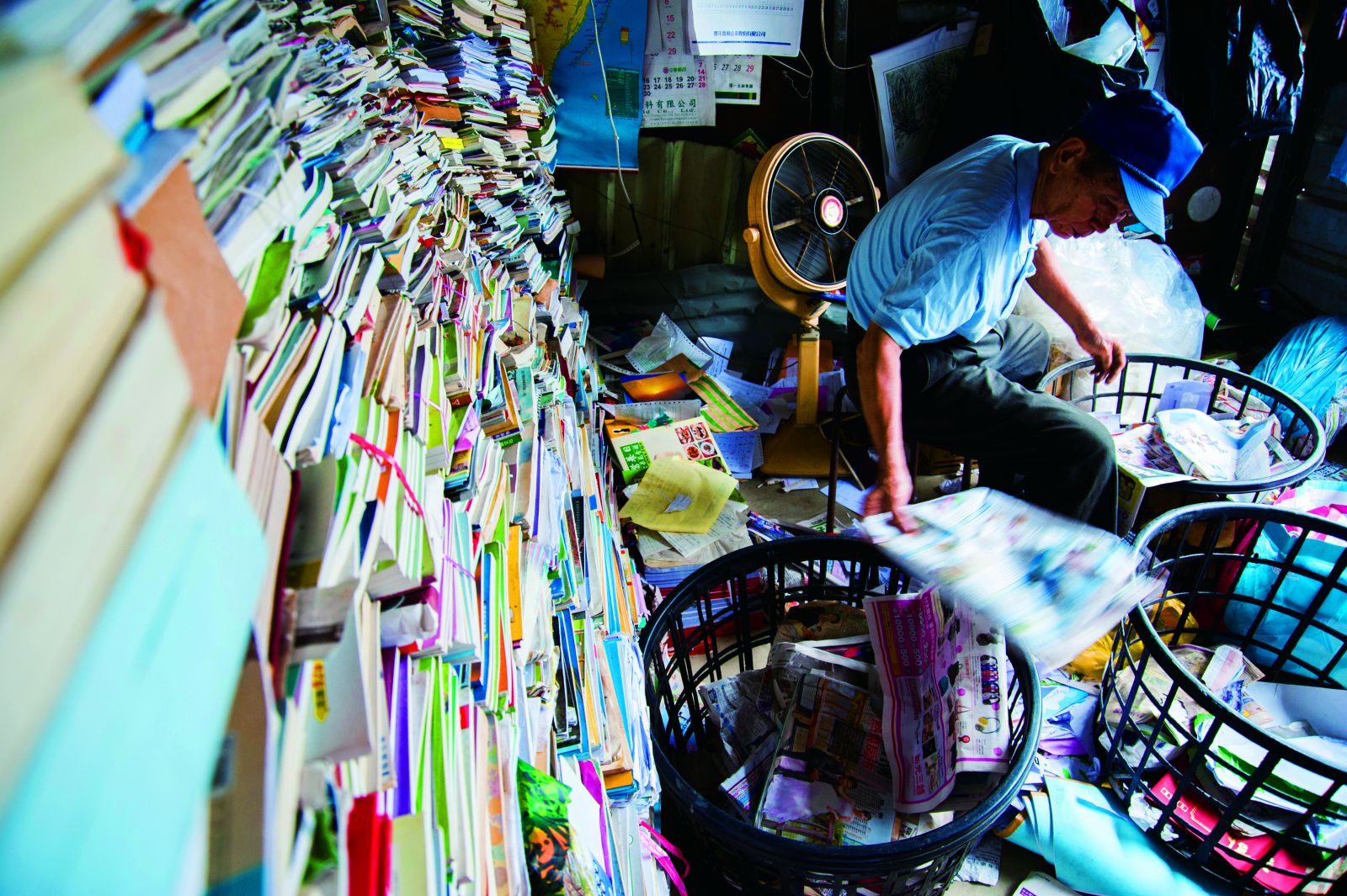 He worries that if he were to miss a day’s work, the paper products would pile up mountain high. That’s why he almost never takes a day off from his work at the recycling station. He goes there even through heavy rains or typhoons, as long as he can safely ride his motor scooter to the station, about ten minutes from his home. Over the years, he has been a constant presence at the station.