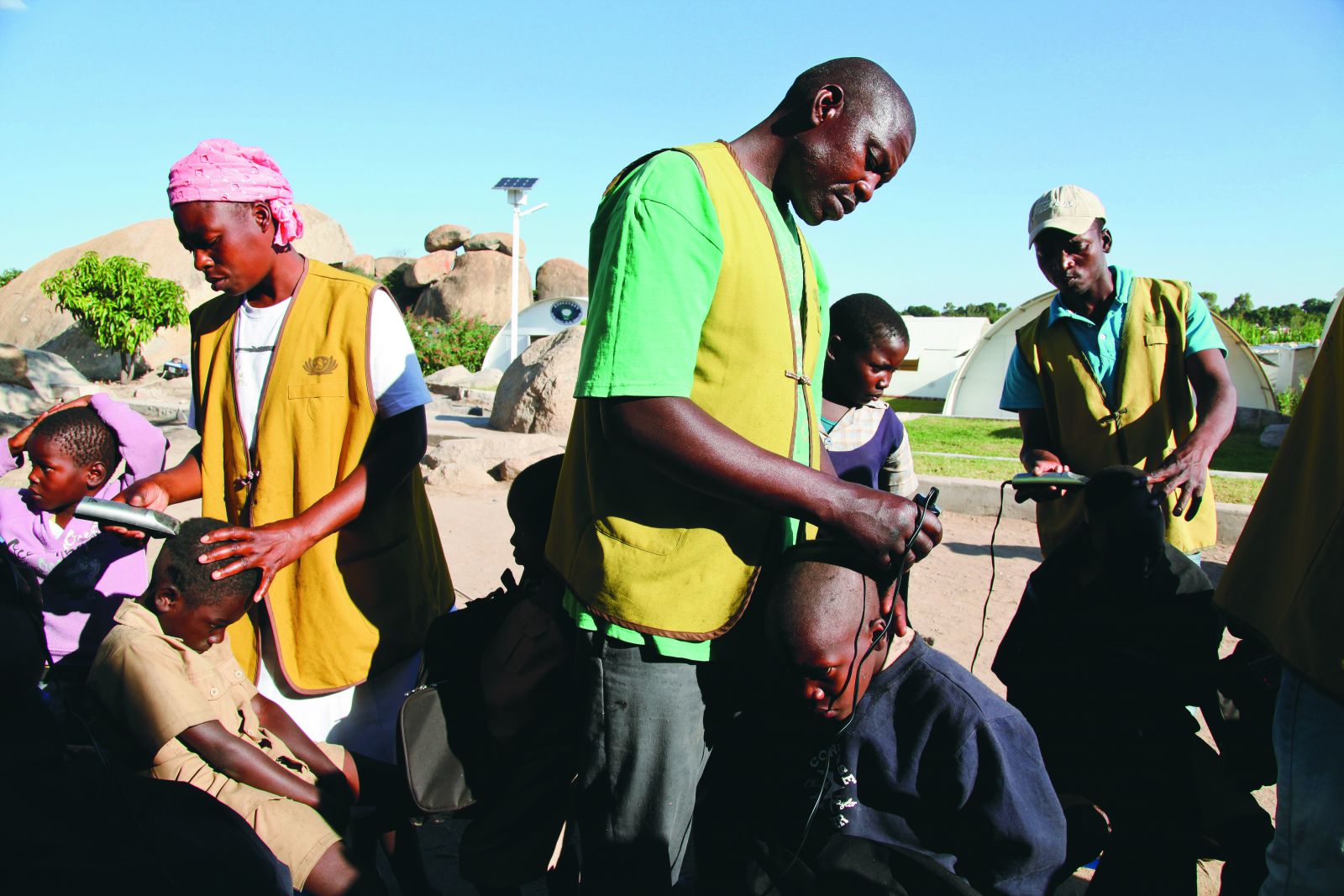 Volunteers cut hair for students at Rusununguko Primary School, located in a suburb of Harare. The service helps prevent scalp ringworm from developing on thace students’ heads.