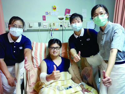 Lu Mei-ying (second from right) and other Tzu Chi volunteers visit Da-fei at National Taiwan University Hospital. Courtesy of Lu Mei-ying