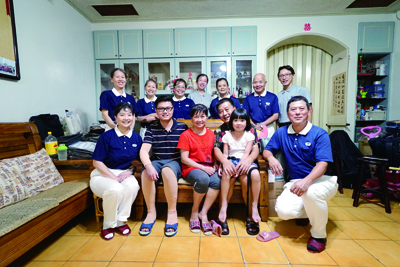 Da-fei, his family, and visiting Tzu Chi volunteers pose for a group picture. Volunteers have continued to care for victims of the disaster even after they are discharged from hospital.
