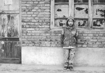 孩子掛著一條黃鼻涕,立在陳舊的師生校舍前,好奇地看著我們這群外來客,