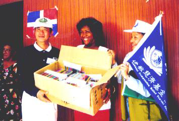 葛濟捨代表慈濟捐贈彩色筆給位於聖塔多明哥市的一所貧民小學。